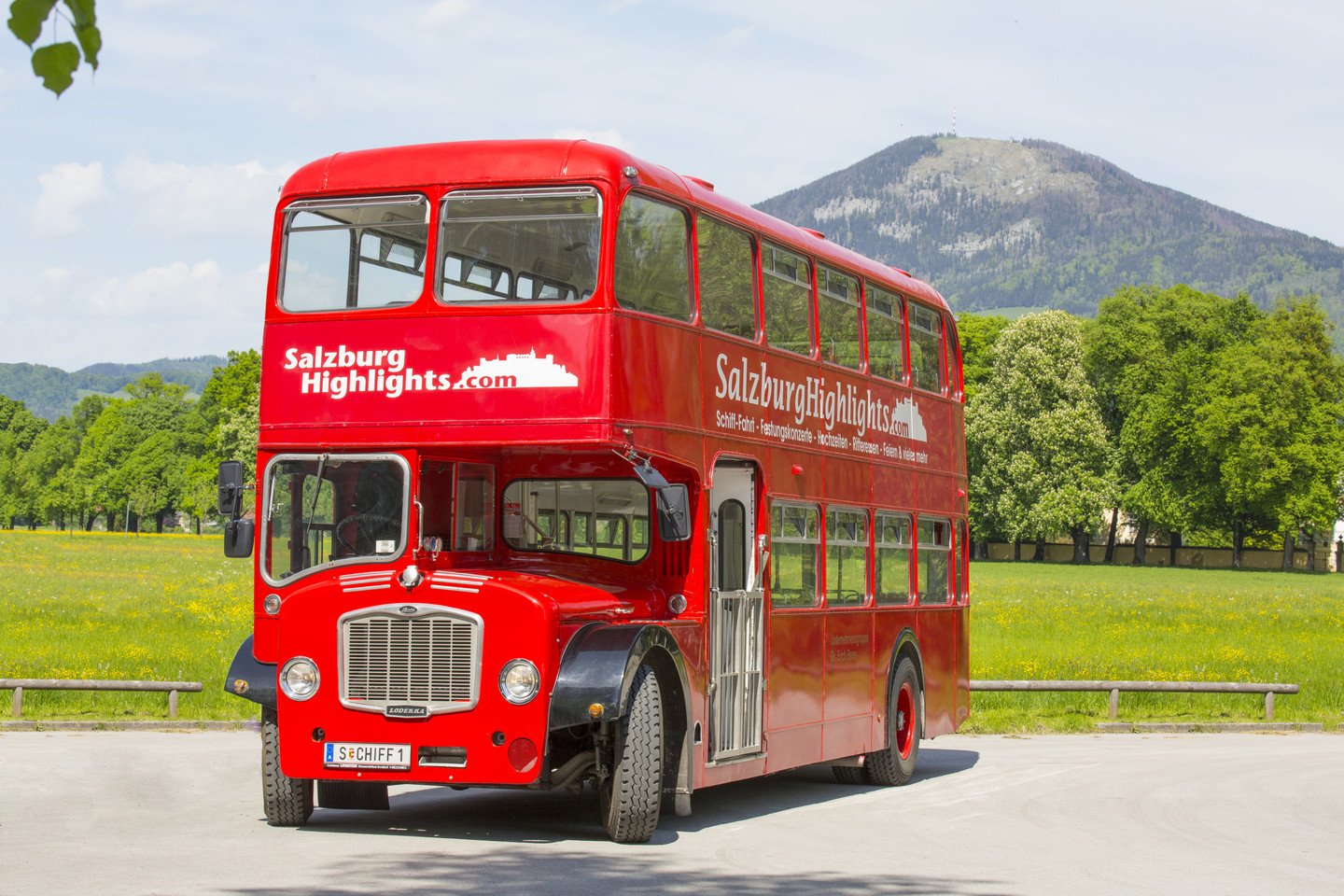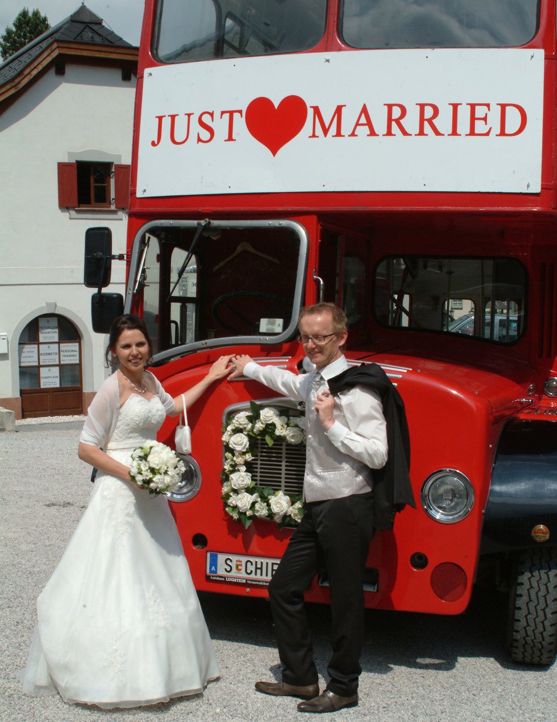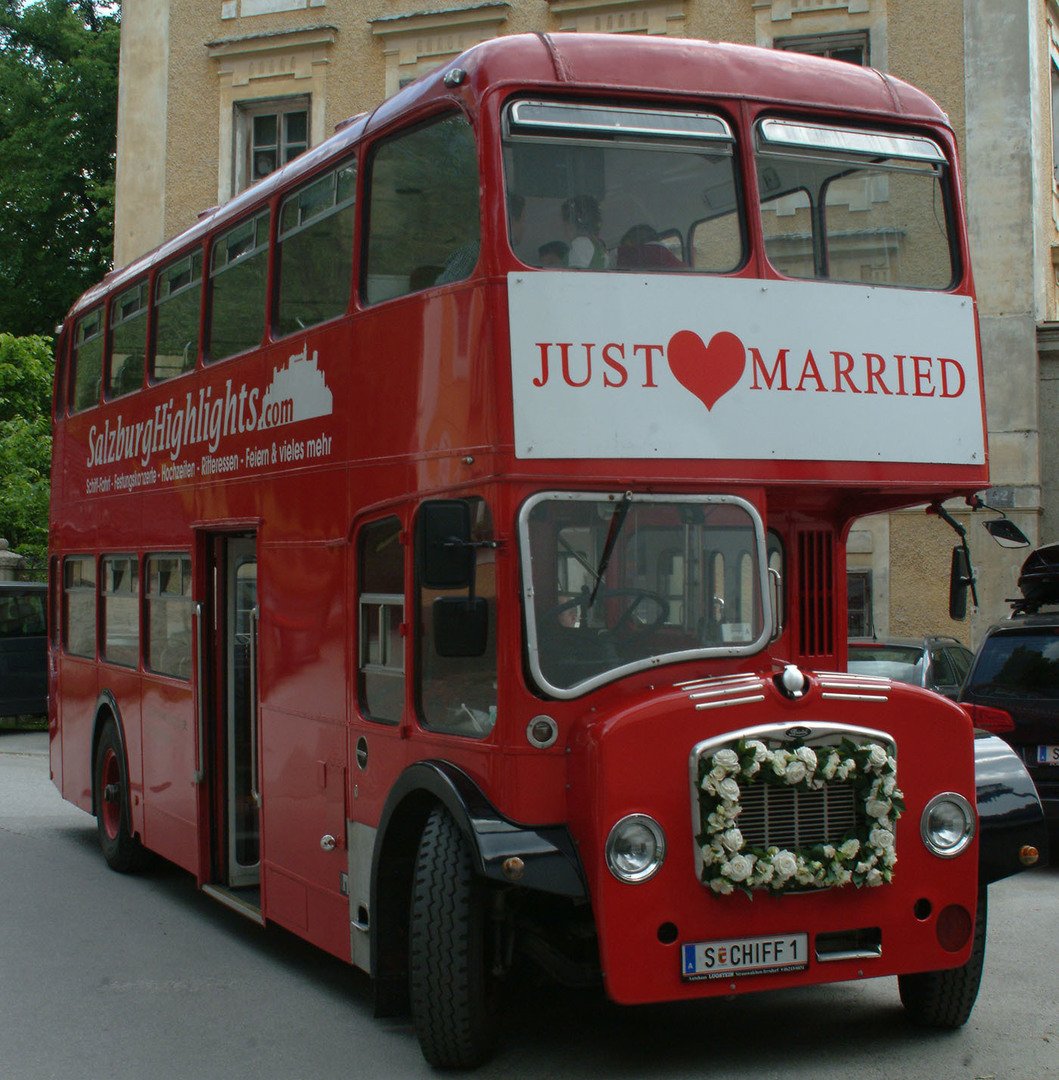 Wie wäre es mit einer Anfahrt zum wahrscheinlich schönsten Trauungssaal der Welt, dem Marmorsaal im Schloss Mirabell, mit unserem historischen, englischen Doppeldeckerbus aus dem Jahr 1964. Ein garantierter Blickfang und ein unvergessliches Erlebnis für alle Beteiligten. Auf Wunsch kann der Bus natürlich auch mit einer "Just married" Tafel versehen oder auch individuell beschriftet werden, z.B. mit den Vornamen von Braut und Bräutigam.