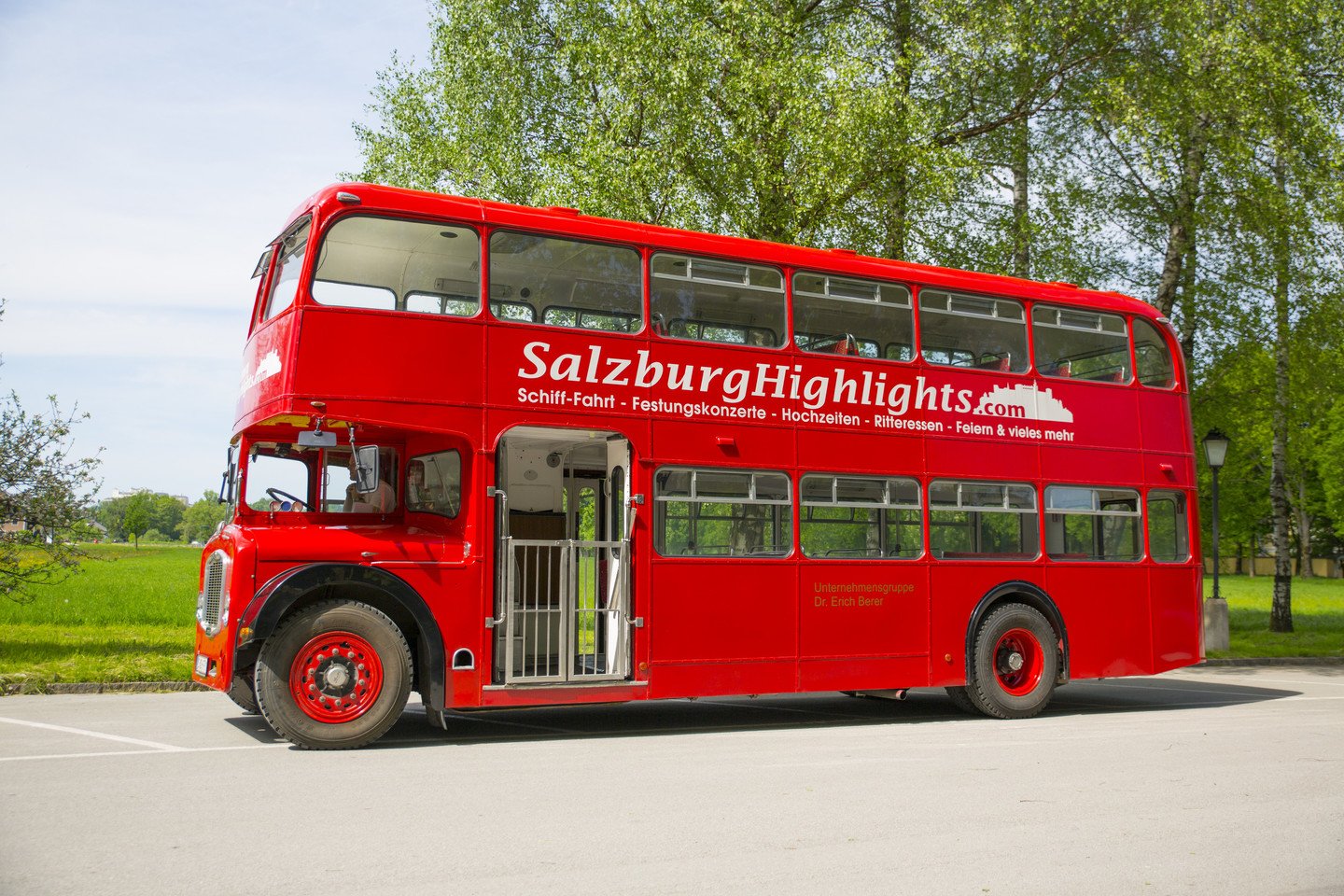 Sie suchen einen ausgefallenen Sightseeing Bus in Salzburg für einzigartige Momente wie Firmenfeier, Geburtstag, Hochzeit, Produktpräsentation oder einen sonstigen Anlass? Buchen Sie unseren englischen Doppeldeckerbus, Sie sind sich der Blicke sicher.